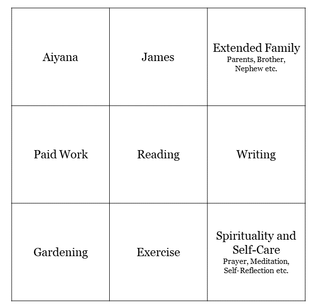 At the time I read Feel the Fear, I was right at the start of my journey of self-exploration. I wouldn’t have been able to include Aiyana, writing, or gardening; my life grid would have looked a little empty. Now it’s jam-packed. I don’t have space for something I consider to be quite a big part of my life – spirituality. I would also love to one day include sewing, and maybe learning to speak French. I guess if I have more children they’ll need to share a square…