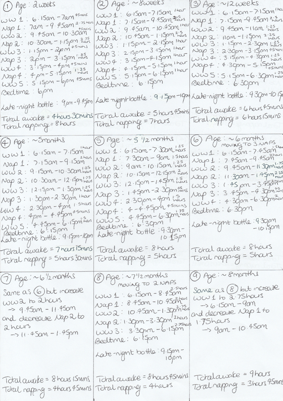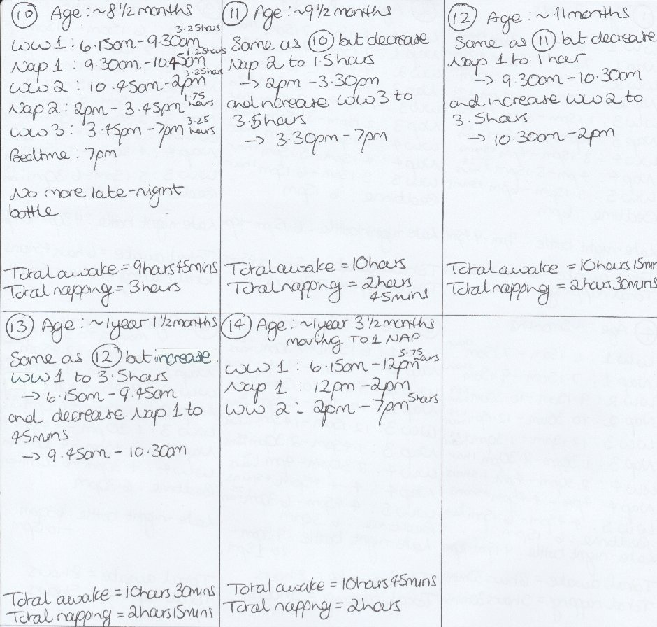 To show you exactly what I mean, I have written out each of Aiyana’s different daily schedules from when she was around two weeks old - when you can start getting your baby into a daily routine since they can start going longer between feeds - to the time of writing (she is still on the last schedule 14 shown, at age one and about nine months). Note that schedules 1 and 2 shown are the schedules I would have had her on had I known about such things at the time; in reality, I did not get her onto a schedule until she was about 12 weeks old i.e. schedule 3. In case it is not obvious, WW stands for wake window. You’ll see that she went from having four naps a day to now only having one. Also note that we gave her a late-night bottle to get her through the night until she was just over 8 months old, and eating enough solid food during the day that she lost interest in it, and that that wake window never increased past 45 minutes.